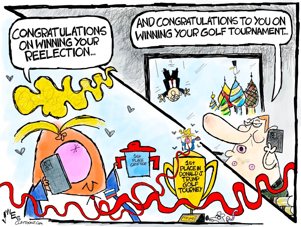 In 2018, despite the warnings from his advisers, then President (sic) Trump congratulated Vladimir Putin on being reelected to the Russian presidency in a sham fixed election. The question here is, did Trump have to throw any golfers off tall buildings to win this tournament? Maybe his opponents’ hazards included MAGAts, alligators, and Giuliani farts. Were the final results of these tournaments calculated by Cyber Ninjas, the pro-Trump firm that recounted the Maricopa County results of the 2020 election? No, wait. Cyber Ninjas couldn’t have counted the results of the golf tournament because they were created shortly before the Arizona recount and shut down immediately after. That’s odd, right?