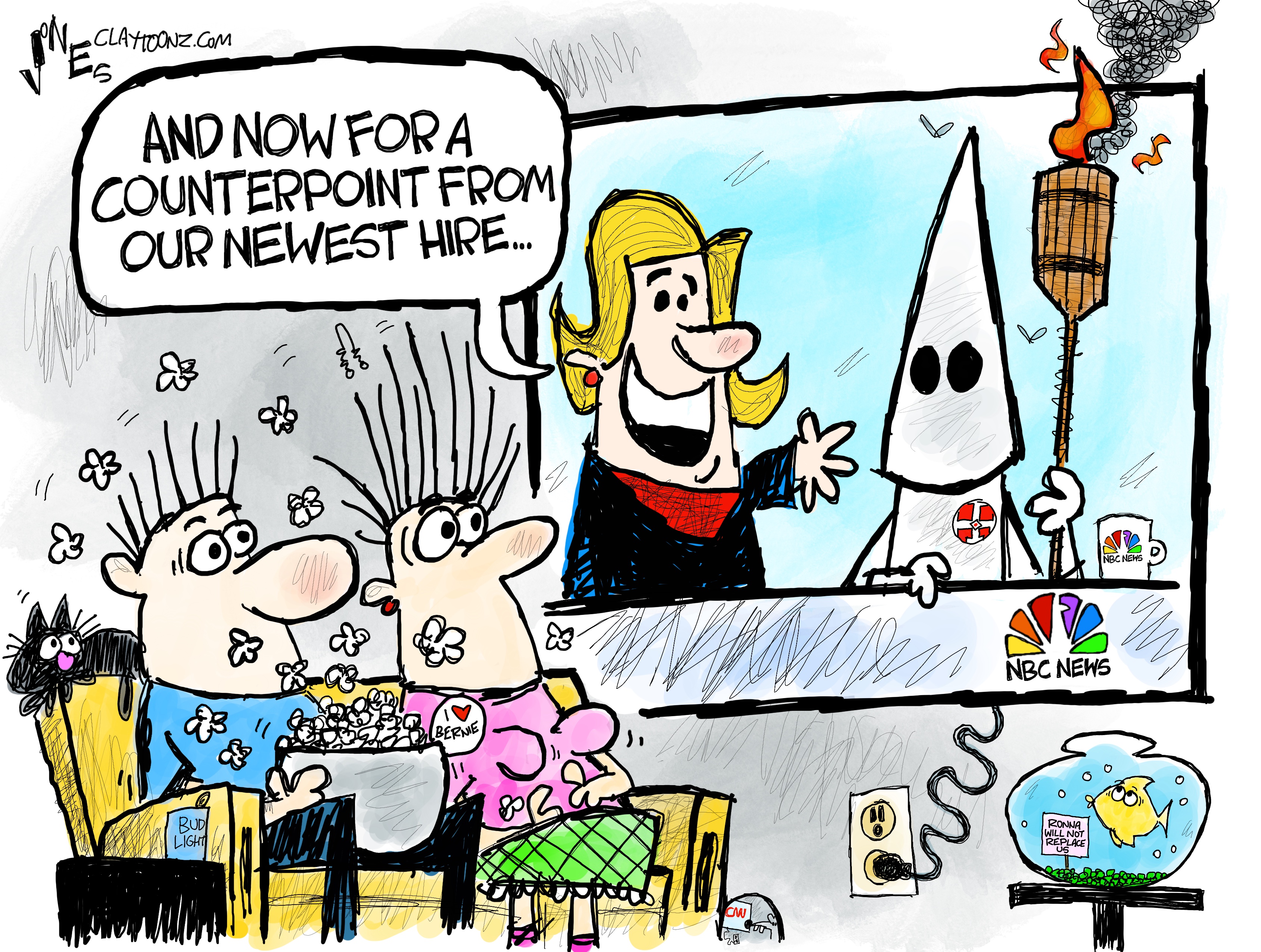Great commentary, Clay! I’m just appalled that NBC would do this and I’m thrilled that the MSNBC anchors stood up for what was right – even Chuck Todd did the right thing! I’m still amazed at the very stupid decisions that supposedly intelligent people make in full view of the world. They must think that most people are just too stupid to have any thoughts about what they’ve done! MSNBC staff knows better (and knows their own viewers are smarter than the rest of the dumb-asses out there in the general public). Btw, love the sign in the gold fish bowl! And maybe it’s just me, but even the electrical outlet looks shocked by the whole fiasco! :)