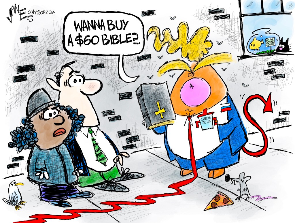1. This is great, Clay – and so many wonderful little ‘Easter eggs’ in it! I’m glad I could enlarge it enough to read the sign in the goldfish bowl. LOL! And I love the cloven hooves. You are so very good at your job! You hit the nail on the head every time! And tRump is such a sleeze-ball used car salesman stereo-type (nothing against the guy who sold me my car!)