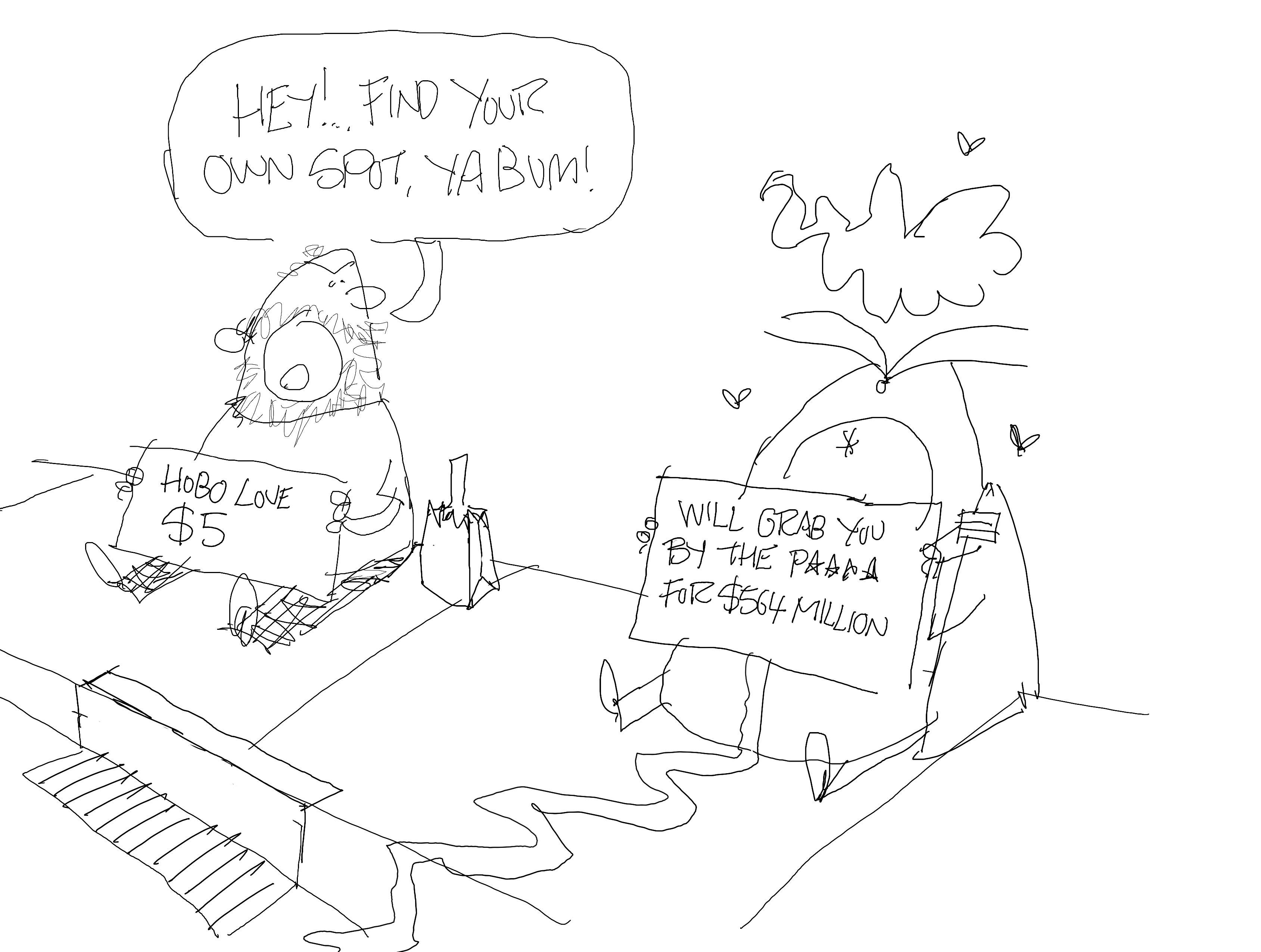 This is the other “weirder” idea. I knew a lot of other cartoonists would be drawing Trump as a beggar and I was right. I really liked the Hobo Love in this cartoon. $5 is a good deal on Hobo Love.