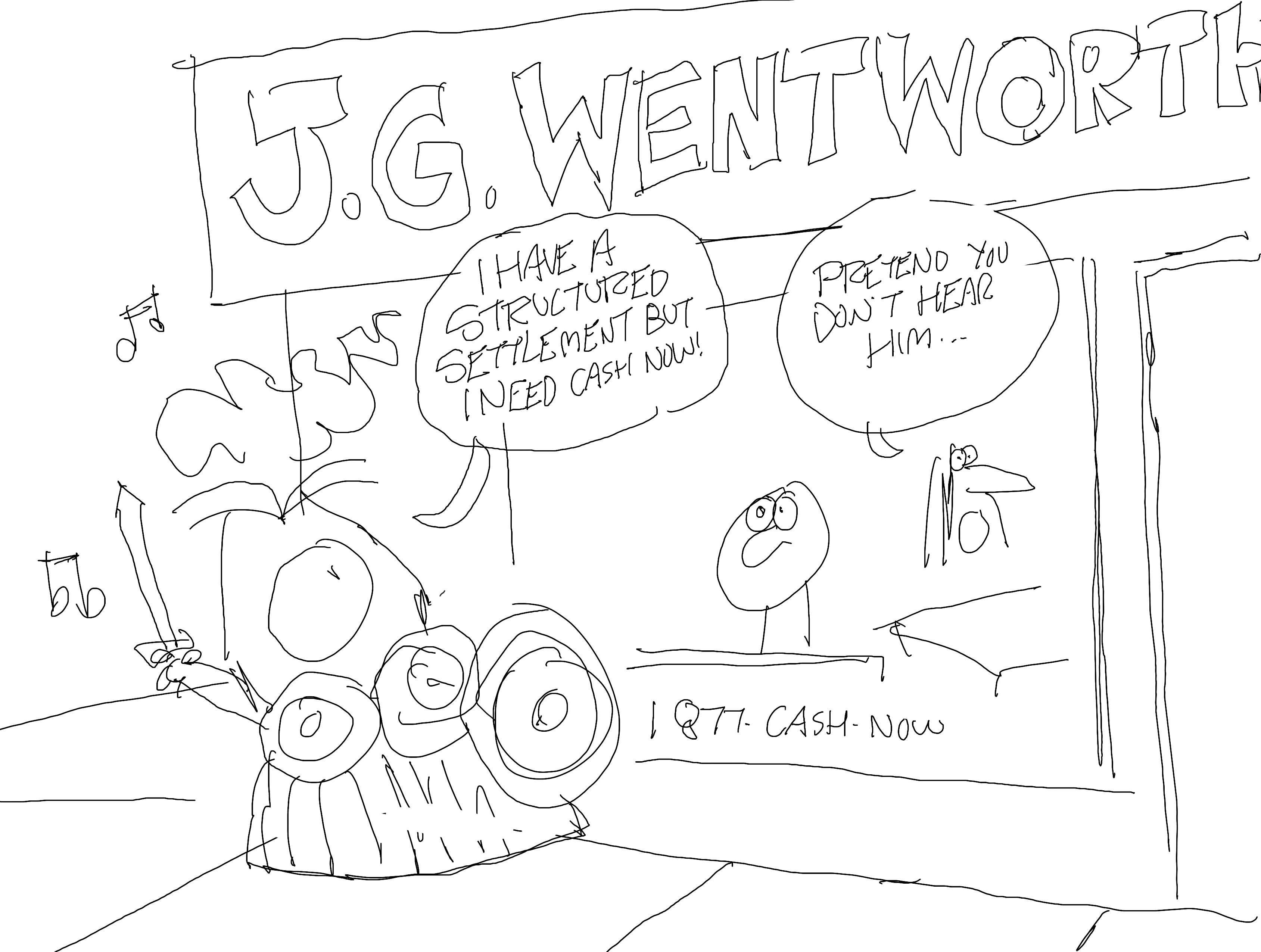 This was drawn last Friday, March 22. I had been trying to get Tom Selleck and reverse mortgages into a cartoon, but this one failed. But speaking of the J.G. Wentworth commercials…