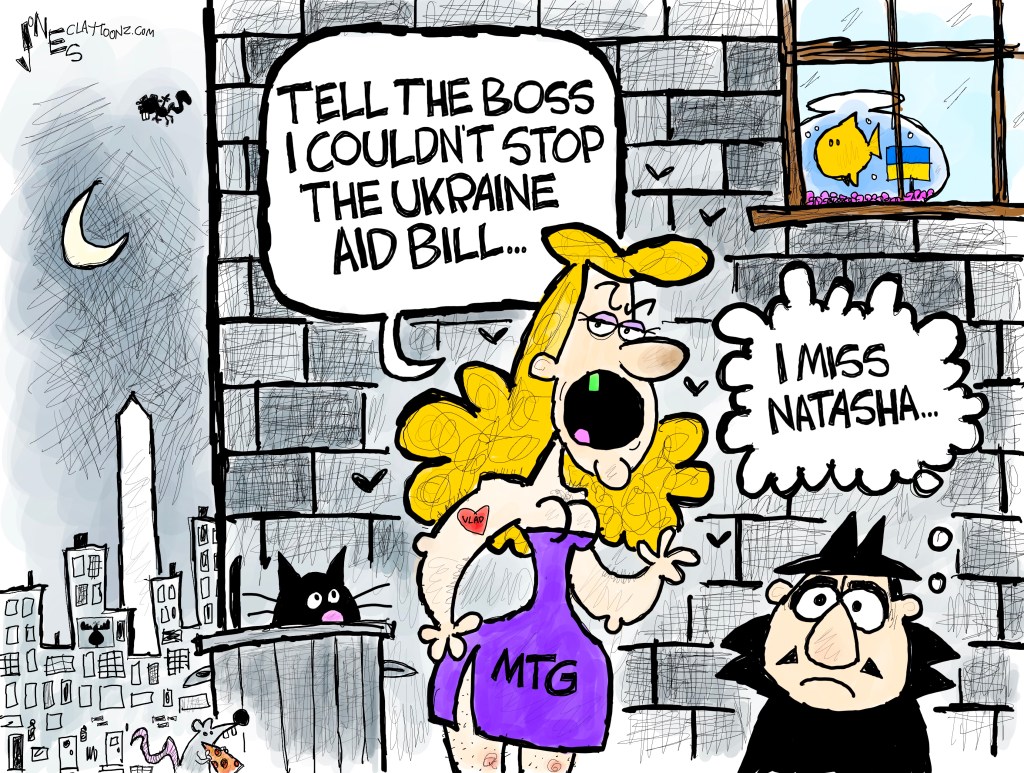 Marjorie Taylor Greene, like Donald Trump, is a Putin stooge. Last week on Steve Bannon’s podcast (who’s another lying Putin stooge), she said Speaker Mike Johnson’s support for a bill funding Ukraine made her “stomach flip over.” And this is a troll who’s said and done a lot of nasty stuff that should make everyone’s stomach flip, like stalking survivors of school shootings, endorsing death threats of former Speaker Nancy Pelosi, and comparing mask mandates to the Holocaust.