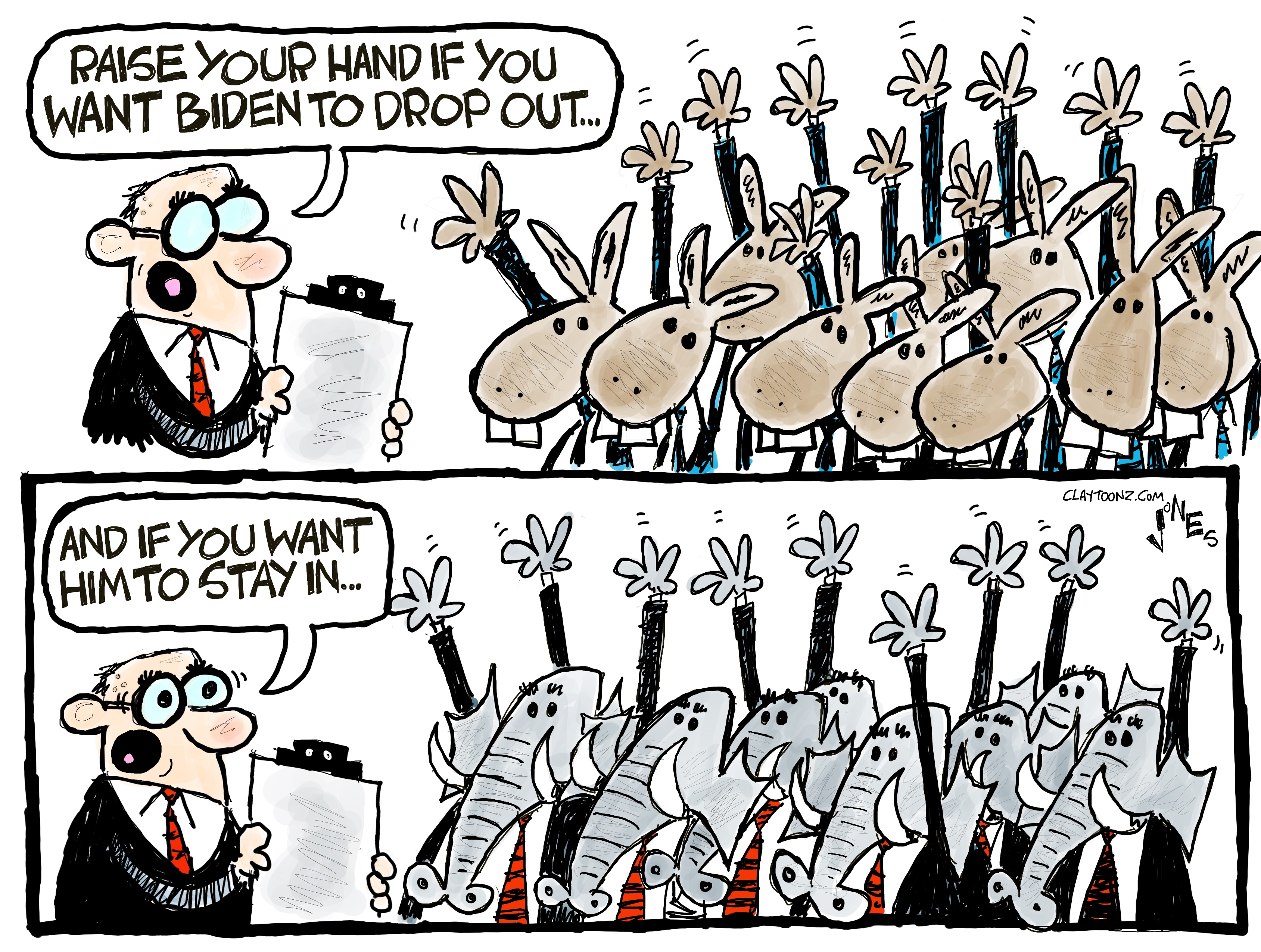 I’m still torn whether I want Biden to drop out or not. I’ve been so happy with him as Prez and think he’s done a great job in most ways. I can’t imagine who could take his place at this late date that could beat tRump, but maybe I’m just not familiar enough with all the possibilities. I don’t think Kamala Harris can win because this country isn’t ready for president that’s a woman and black on top of it (Obama just about put all the racists over the edge, can you imagine what a female version would do??) I really like Pete Buttigieg, but this country isn’t ready for him either. I don’t know – and since I have no control over it, I’ve decided not to freak out over it. I just know whoever runs on the Dem’s side, I’ll be voting for him/her. Anyway, I like the cartoon and it’s right on target!