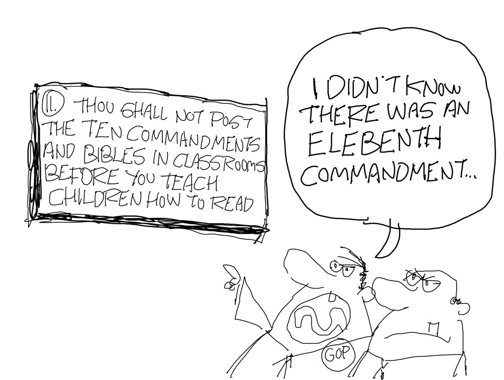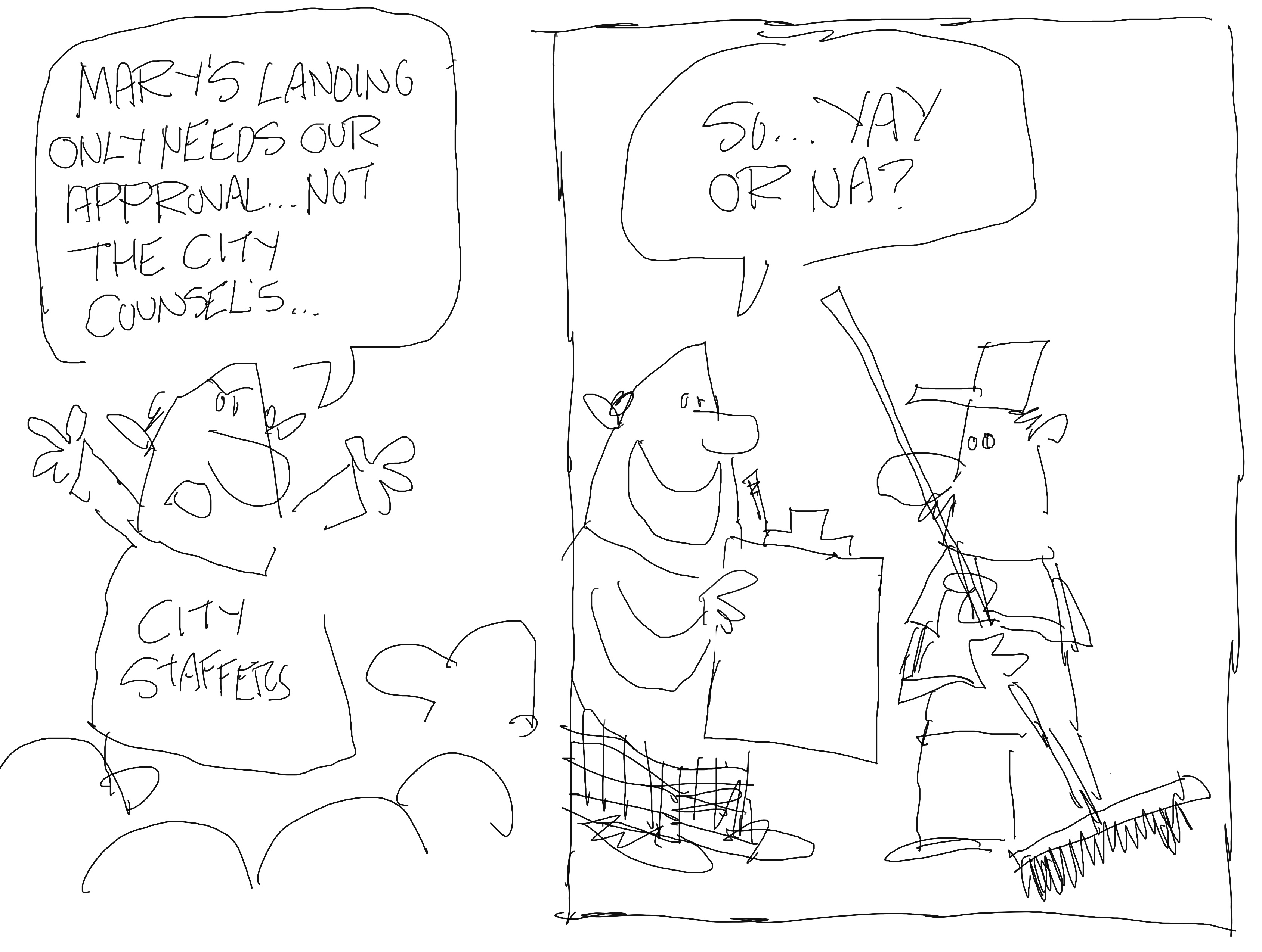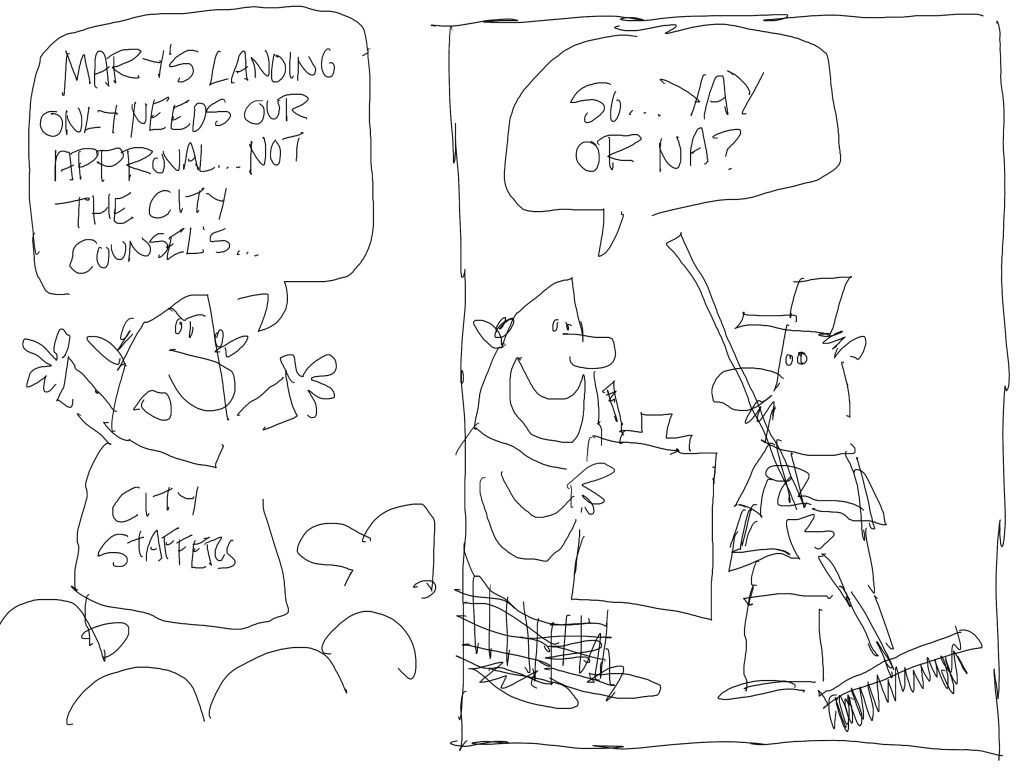This wasn’t the right cartoon and Martin, my editor, asked me to explain it. I knew then it didn’t work. I forgot to finish spelling “nay.” I also misspelled Council.