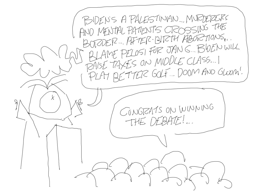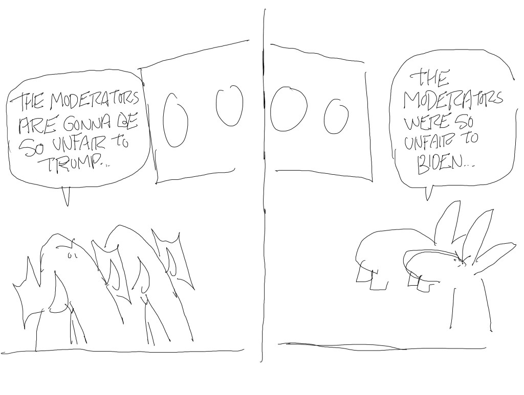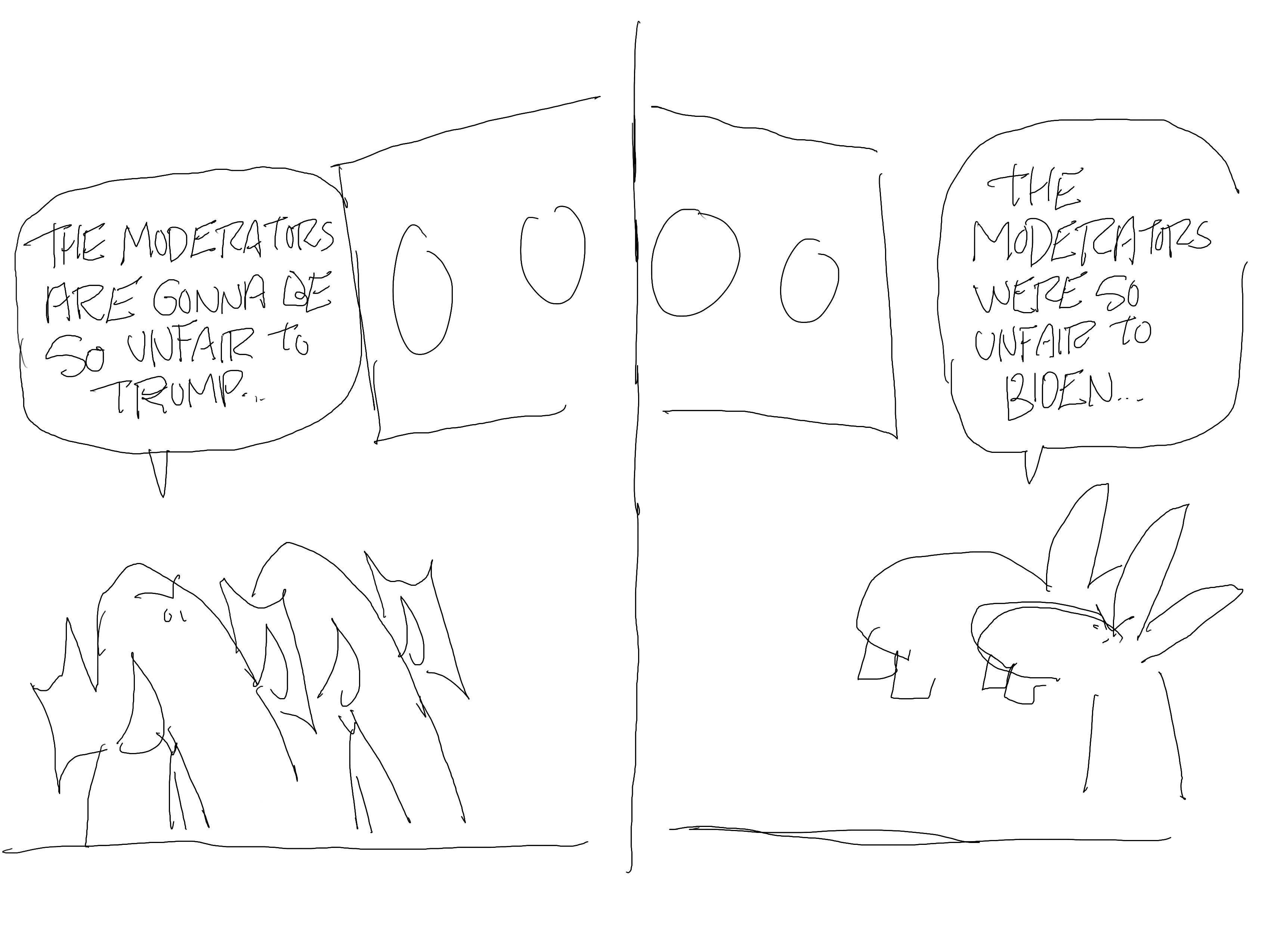 My editor at CNN presented me with a challenge last Thursday before the debate. Without knowing what was going to happen during the debate, he wanted TWO cartoons on it, one for Trump and one for Biden. There was nothing in my assignment about presenting something positive about both guys. This was interesting for me because I had no idea what kind of cartoons I would write.