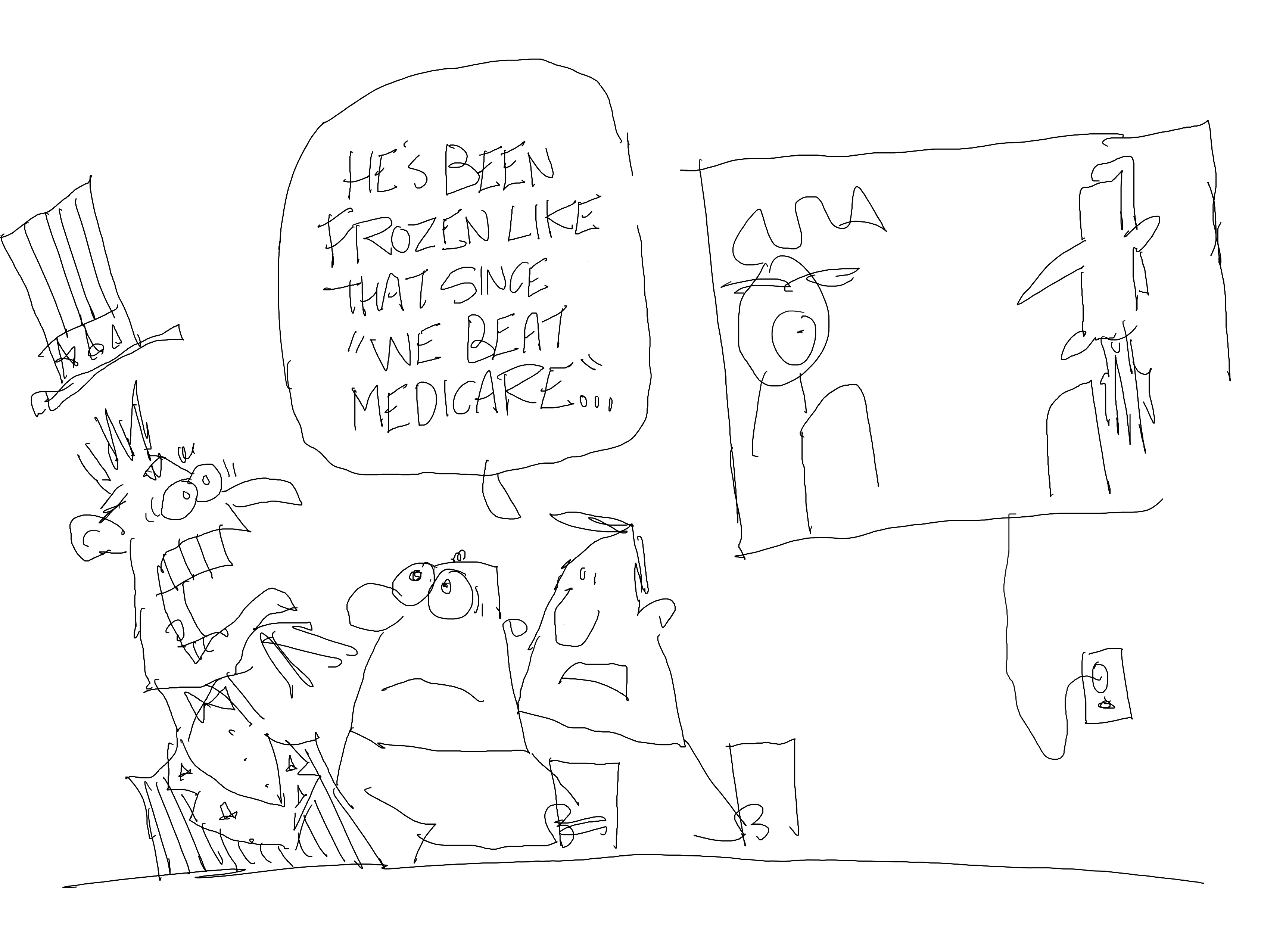 I don’t think I’ve ever used this cliché before, but I like it. A cliché can be so cliché but at other times, they’re perfect. But we didn’t use this. A few days later, my buddy Rob Rogers used the concept and he told me he knew someone else would think of it as well. I told him that I think of these same concepts because all of us satirists grew up on the same movies.