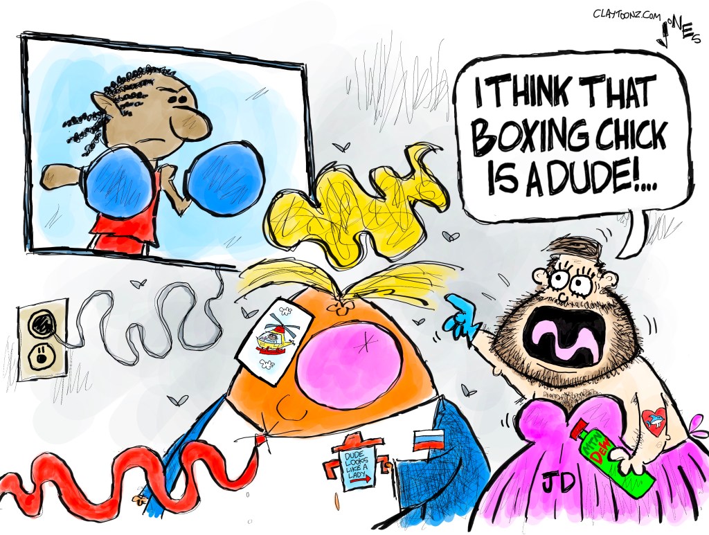 No one expects anything but hypocrisy from these people. Why is this newsworthy? A woman from Morocco just won a gold medal. She’s a female since birth, has fought only women, lost several bouts and is presently peeking as an athlete. Leave her out of your petty parochial disputes. We learn nothing from this cartoon. A miss, Clay.