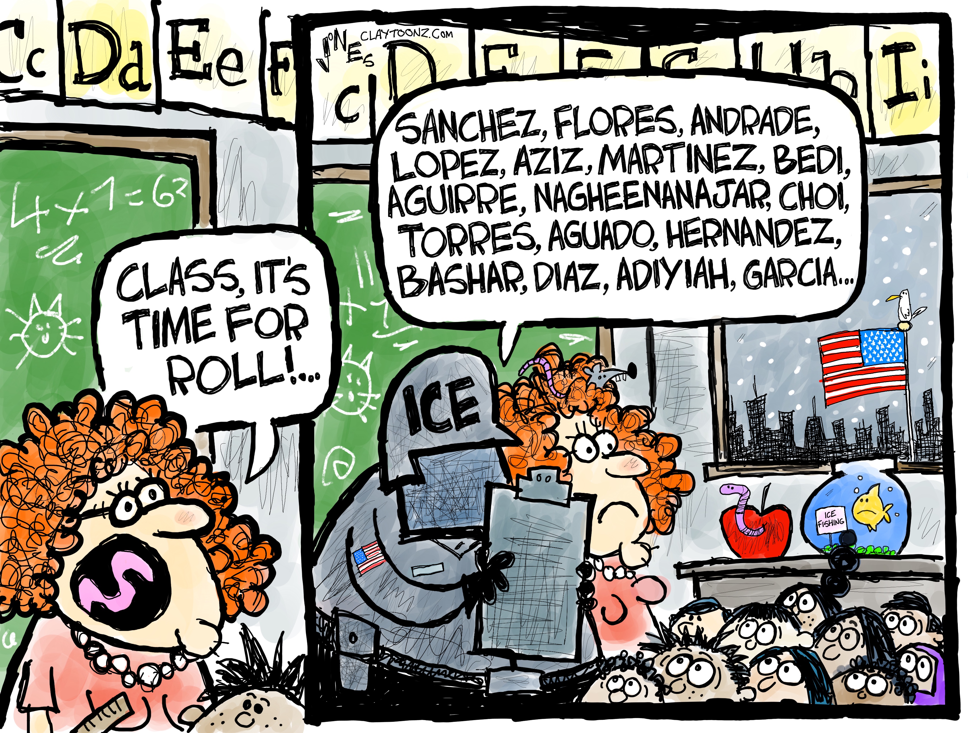 2. The first two commenters are correct. Be assured, many of the children picked up in this manner have birthright citizenship, even if their parents are not documented (although they may be awaiting judication as asylum seekers.) But that’s really not the point of the cartoon. It’s that schools, hospitals, and churches are places where people congregate and the “criminals” can be detained on mass.