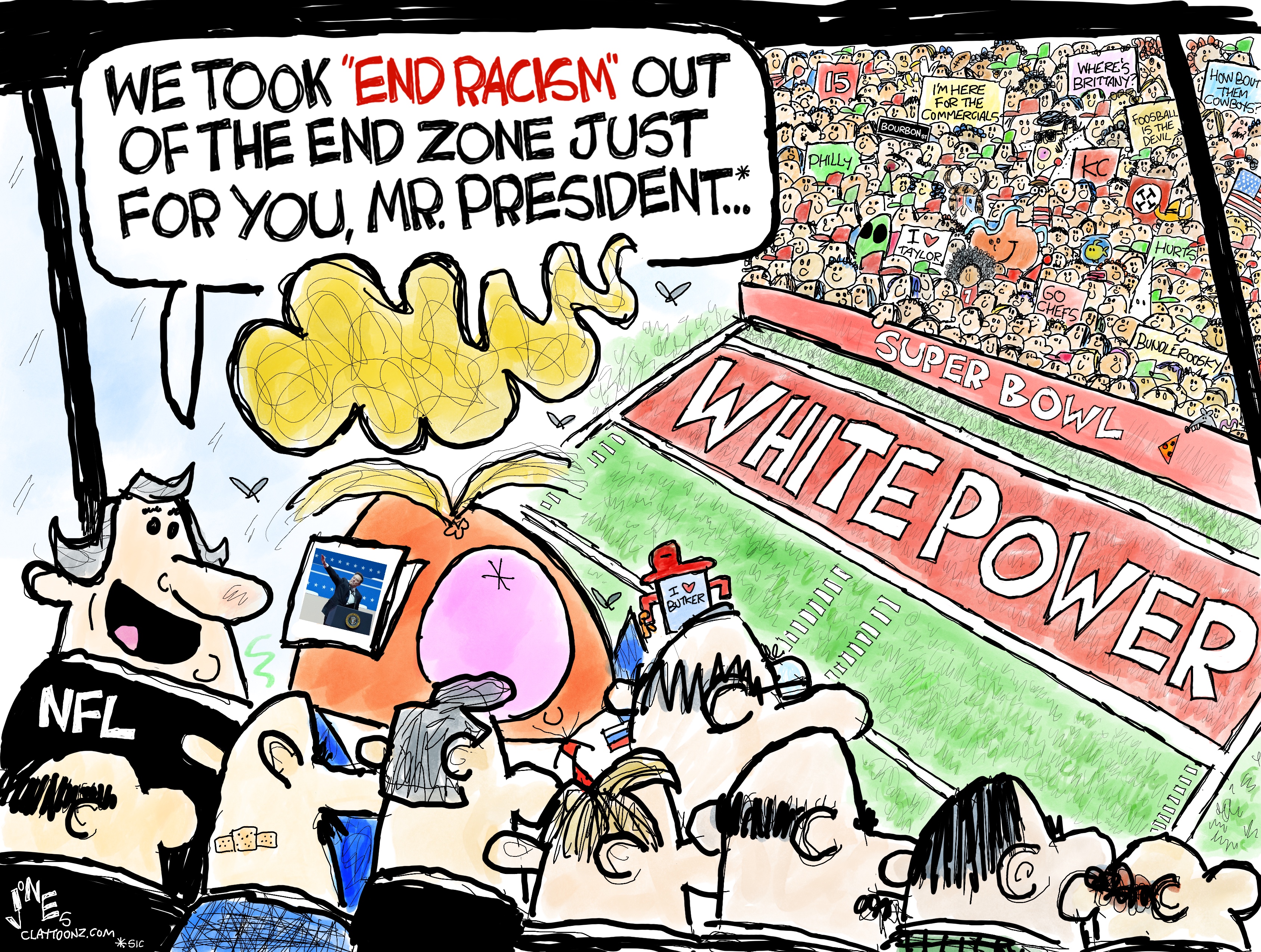 Signed prints: Each signed print costs $40.00. Every cartoon at Claytoonz is available. Payment is accepted through PayPal, Venmo (clay-jones-87), or snail mail to Clay Jones, P.O. Box 3721, Fredericksburg, VA 22402.