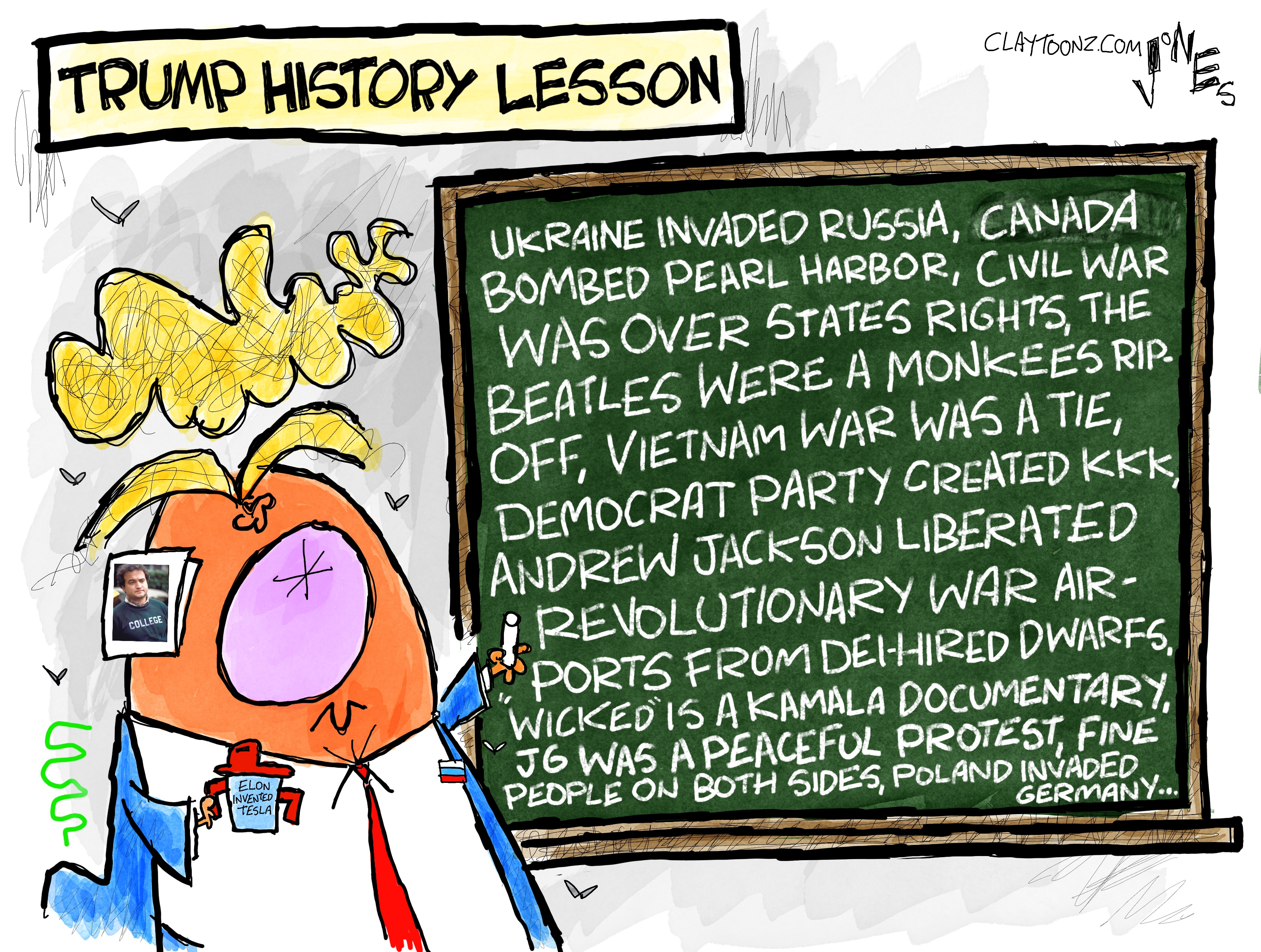 Signed prints: Each signed print costs $40.00. Every cartoon at Claytoonz is available. Payment is accepted through PayPal, Venmo (clay-jones-87), or snail mail to Clay Jones, P.O. Box 3721, Fredericksburg, VA 22402. Add to the note what you’re purchasing.