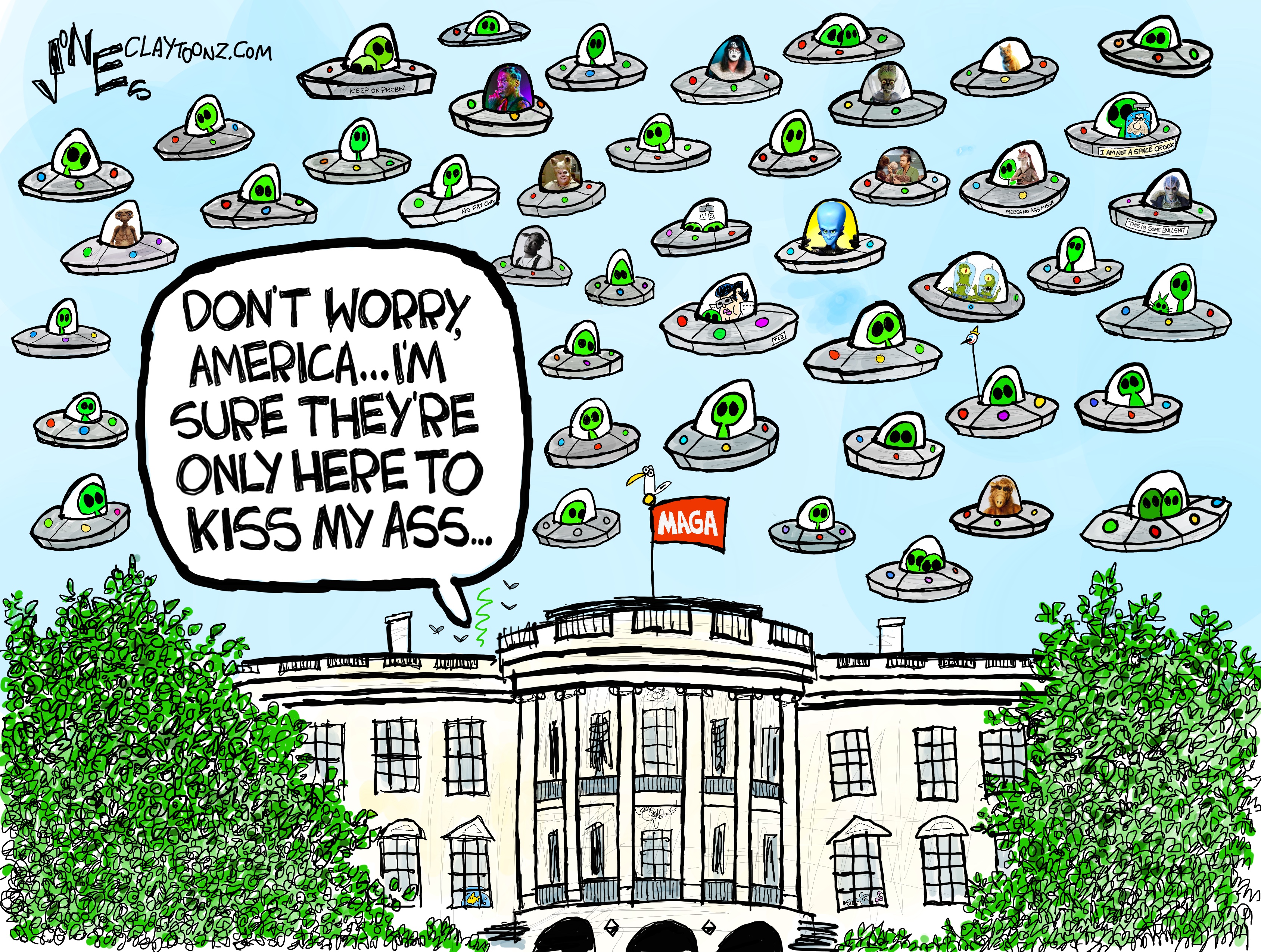 Signed prints: Each signed print costs $40.00. Every cartoon at Claytoonz is available. Payment is accepted through PayPal, Venmo (clay-jones-87), or snail mail to Clay Jones, P.O. Box 3721, Fredericksburg, VA 22402. Add to the note what you’re purchasing.