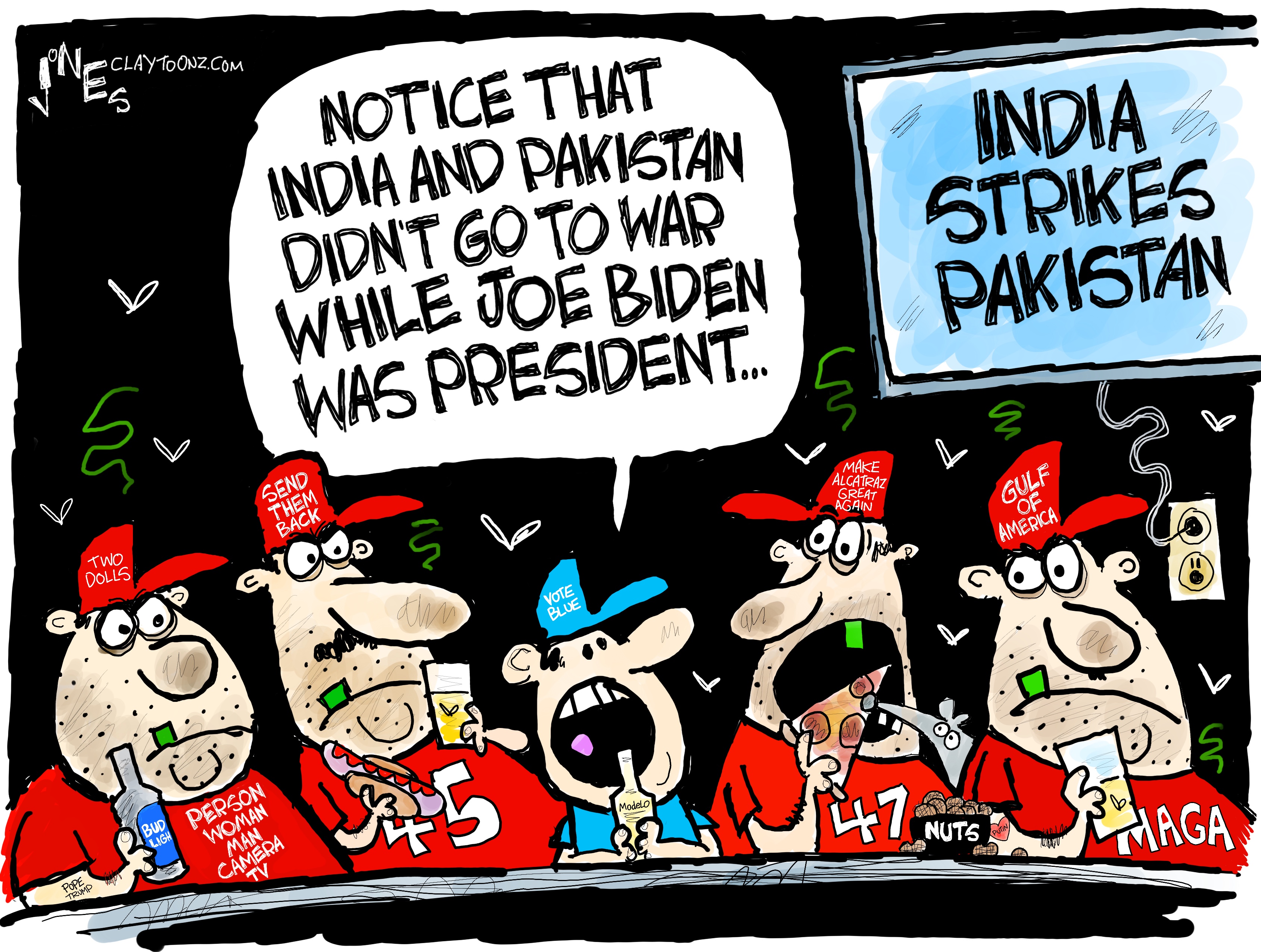 Signed prints: Each signed print costs $40.00. Every cartoon at Claytoonz is available. Payment is accepted through PayPal, Venmo (clay-jones-87), or snail mail to Clay Jones, P.O. Box 3721, Fredericksburg, VA 22402. Add to the note what you’re purchasing.