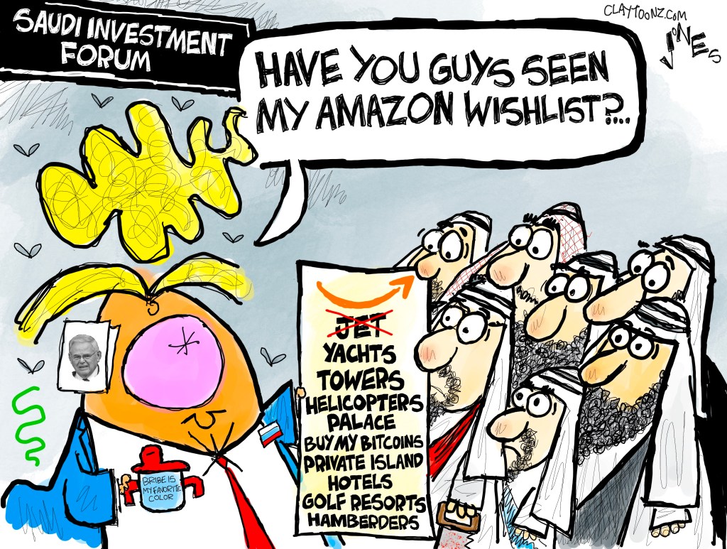 Signed prints: Each signed print costs $40.00. Every cartoon at Claytoonz is available. Payment is accepted through PayPal, Venmo (clay-jones-87), or snail mail to Clay Jones, P.O. Box 3721, Fredericksburg, VA 22402. Add to the note what you’re purchasing.