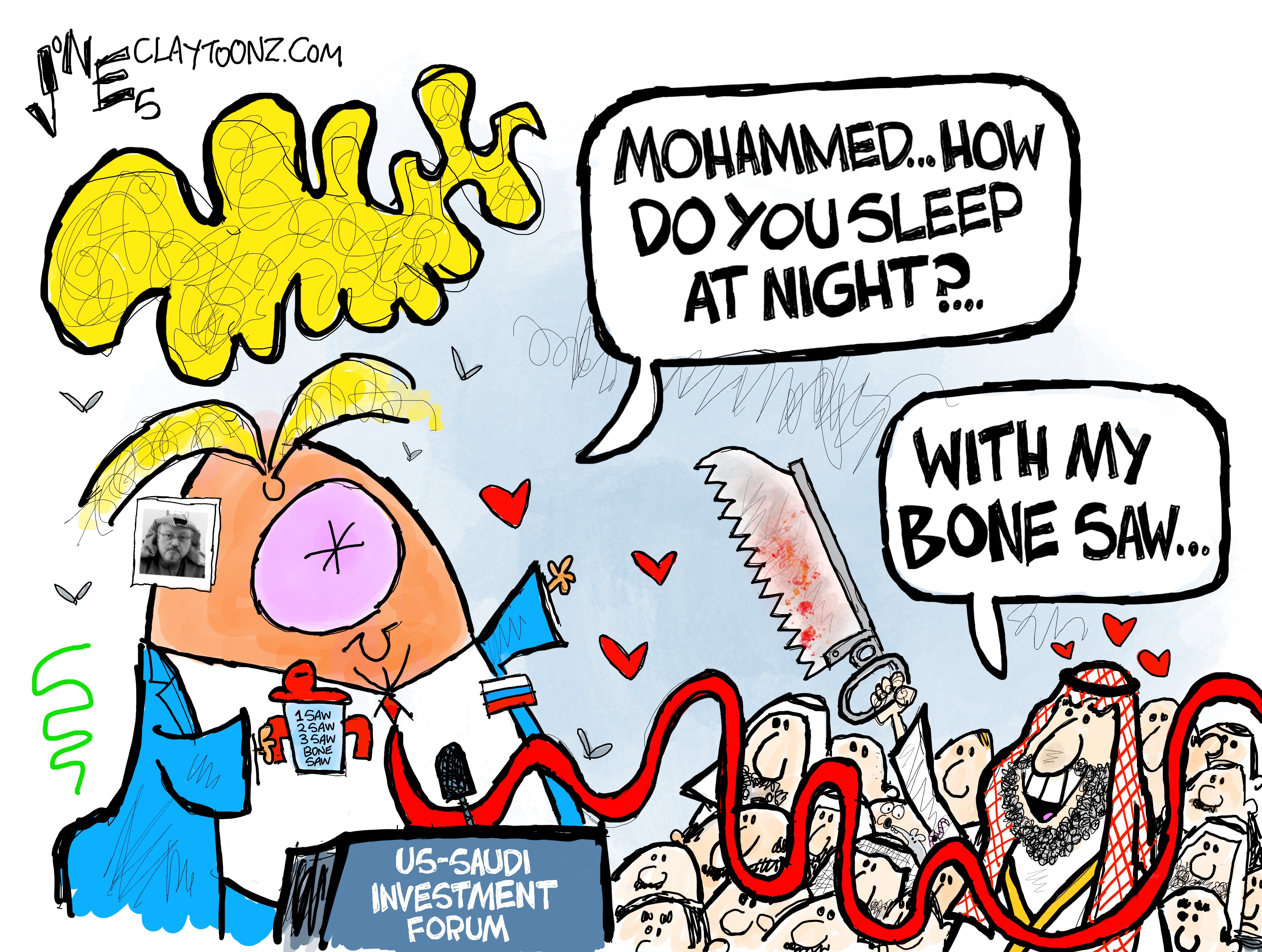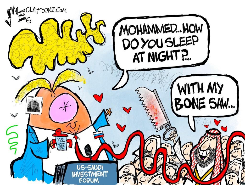 Signed prints: Each signed print costs $40.00. Every cartoon at Claytoonz is available. Payment is accepted through PayPal, Venmo (clay-jones-87), or snail mail to Clay Jones, P.O. Box 3721, Fredericksburg, VA 22402. Add to the note what you’re purchasing.