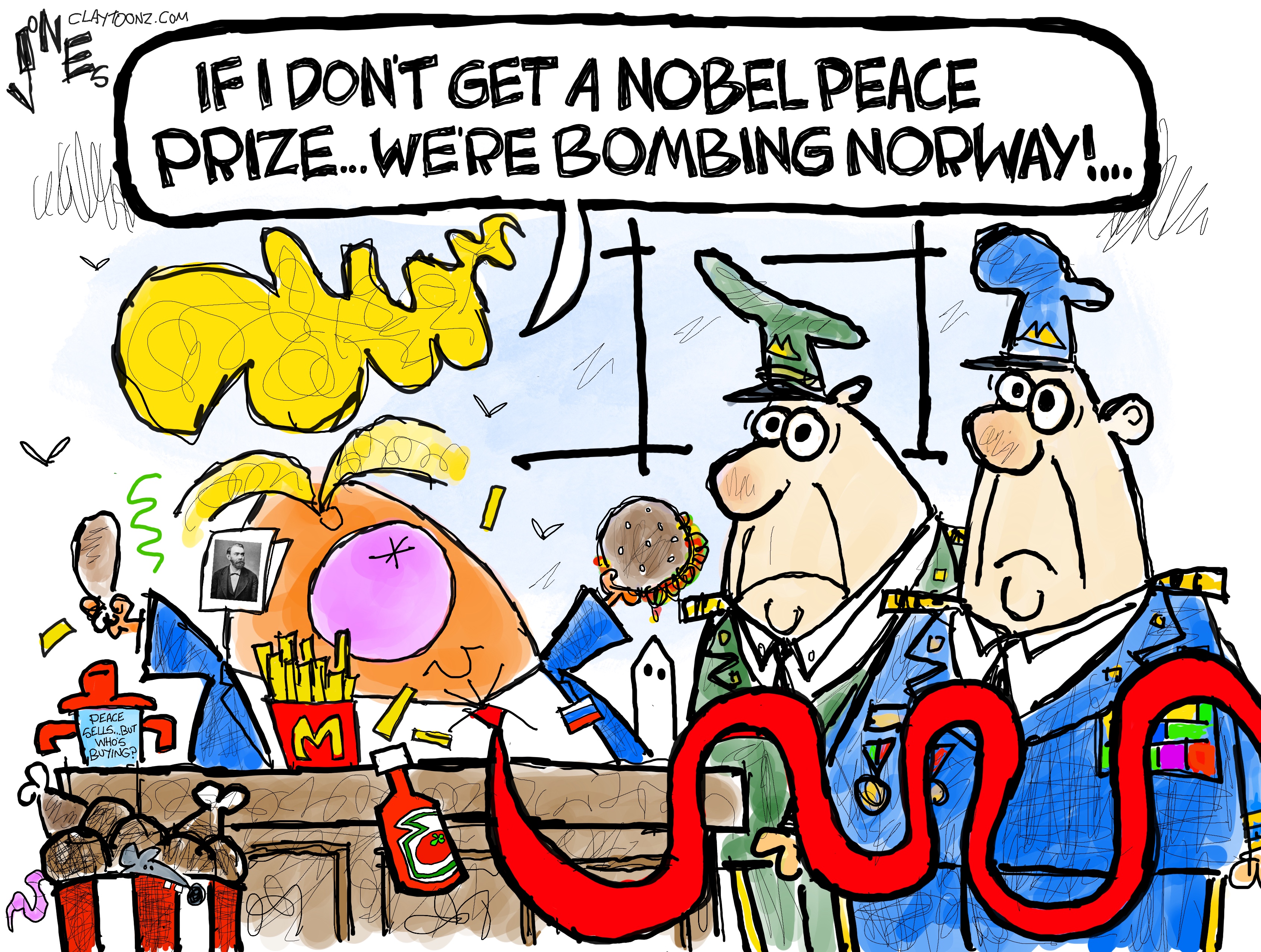 Excellent cartoon, Clay. I have often thought the reason Obama got his was for not being the Shrub. Carter didn’t get his for his presidency; rather he received it for his post-presidency. TR got his for negotiating peace between the Japanese and the Russians. The Mango Mussolini believes he should receive one. I would ask: for what precisely does he deserve anything more than contempt? And a prison term.