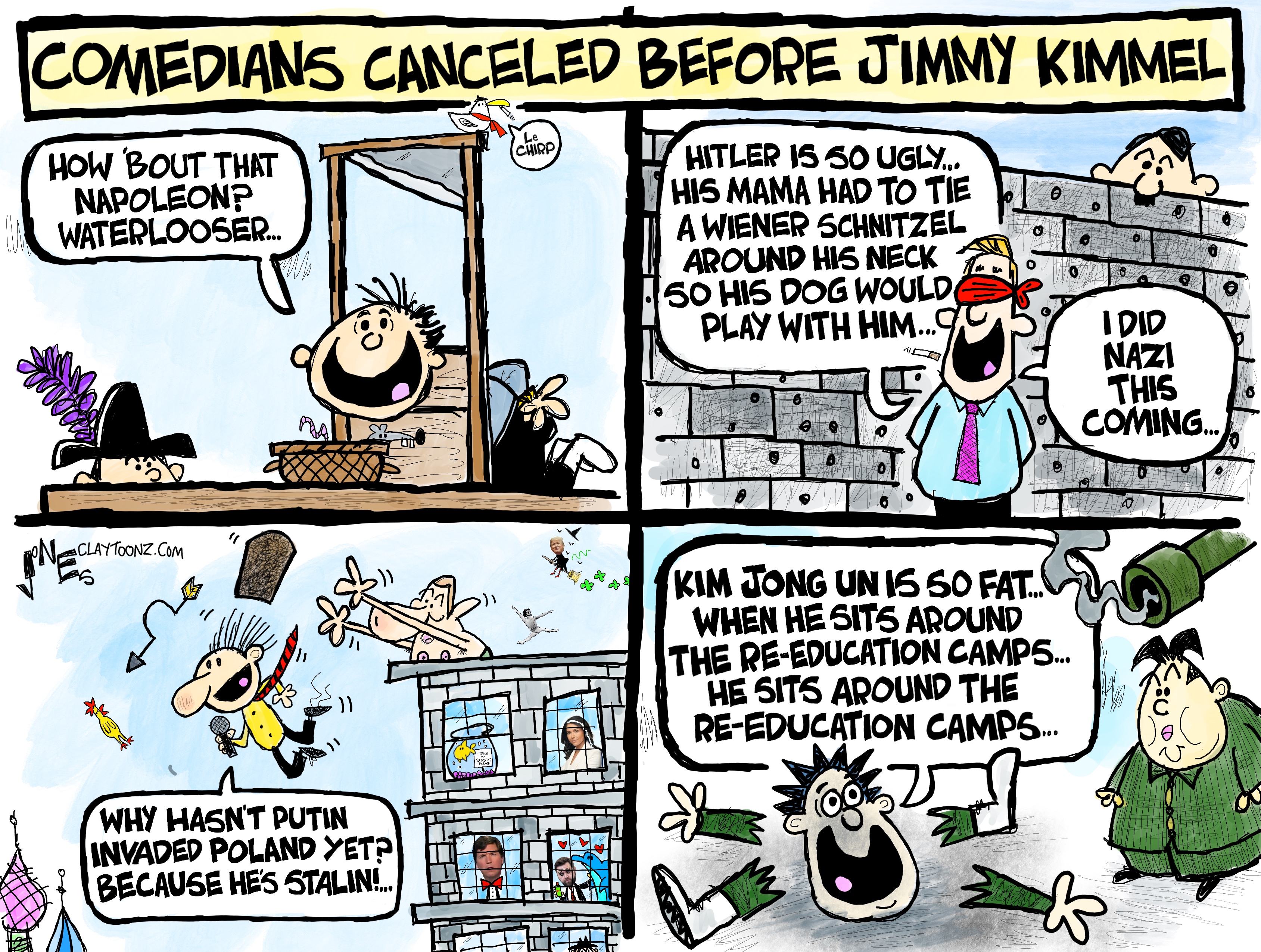 Signed prints: Each signed print costs $40.00. Every cartoon at Claytoonz is available. Payment is accepted through PayPal, Venmo (clay-jones-87), or snail mail to Clay Jones, P.O. Box 3721, Fredericksburg, VA 22402. Add to the note what you’re purchasing.