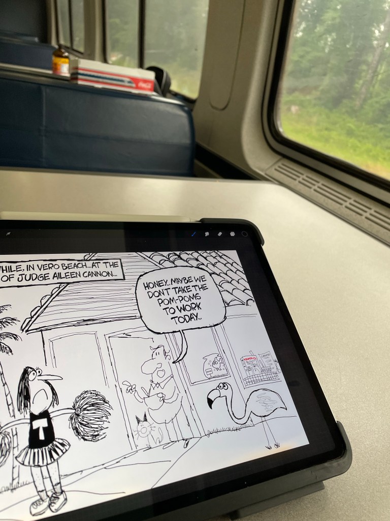 By the way, even after 42 hours with the only little sleep I’ve had being train sleep, I’m still working on CNN’s cartoon for this week, and it’s 10 P.M. Your favorite goofball cartoonist needs food and sleep.